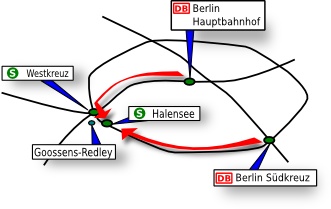 Nehmen Sie die S75, S9 (Richtung Spandau) oder S7 (Richtung Potsdam) bis S-Bhf Westkreuz. Steigen Sie dort in die S42 (Richtung Schöneberg) oder S46 (Richtung Königs Wusterhausen) um und fahren eine Station bis Haltestelle S-Bhf Halensee. Beim Ausgang gehen Sie an der Ampel über die Straße und links über die Brücke, am Ende der Brücke die Straße rechts rein.